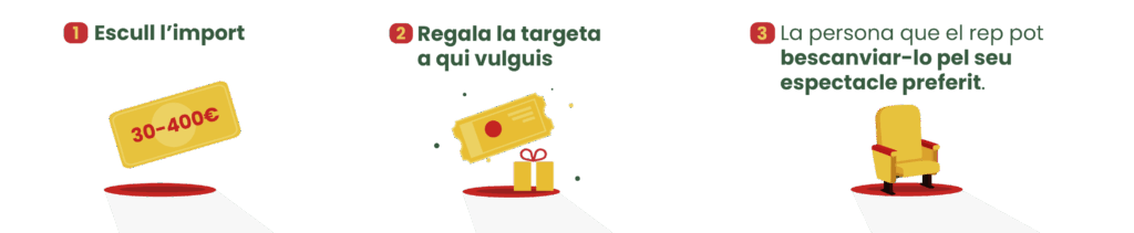 La persona que rebi la targeta Regala Teatre podrà comprar entrades pels espectacles del Teatre Condal (www.teatrecondal.cat), Teatre Romea (www.teatreromea.cat), Teatre Goya (www.teatregoya.cat) i La Villarroel (www.lavillarroel.cat) fins exhaurir el saldo de la targeta regal. *No vàlid pels espectacles de la programació de Flaix de Tardor.